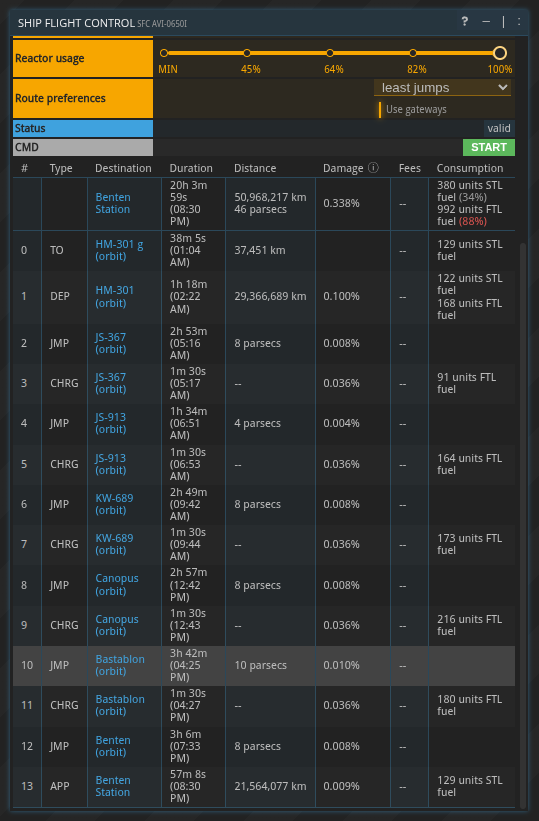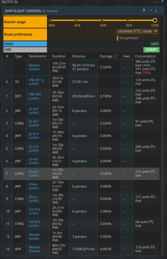 Although most of the time least jumps and shortest FTL route will be the same path it is nice to have this option. One issue I’ve found though is this sometimes doesn’t work right when there are multiple routes that have the same number of jumps. Since {Least Jumps} is the default selection it would be good in those instances if the route selected is also the shortest one. Or better yet, maybe just make {Shortest FTL Route} the default selection. In the example below, both options have the same number of flight segments but {Least Jumps} chose the longer flight.